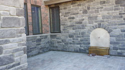 Coal Canyon Cobblestone with Hartford Tundra Brick and Echo Ridge Fireplace
