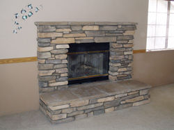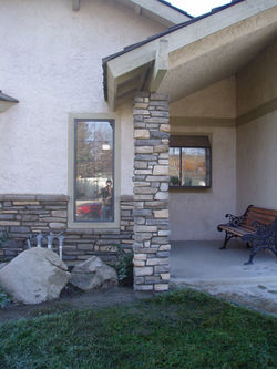 Rocky Mountain Quartzite gold color paving set in concrete with Eldorado "Cognac Country Rubble" stone and Eldorado buckskin color caps really make a difference to this homeowner's porch and entry walkway.